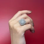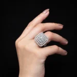 The Imperial Square Halo Ring is designed around a structured, architectural silhouette. A central arrangement of baguette-cut stones forms a clean square core, surrounded by multiple pavé-set halo frames that create depth and layered brilliance.