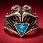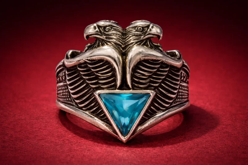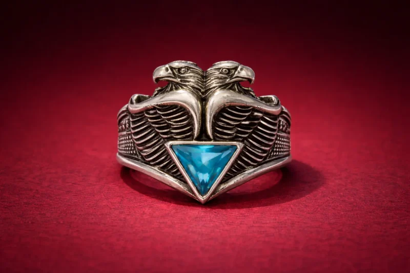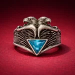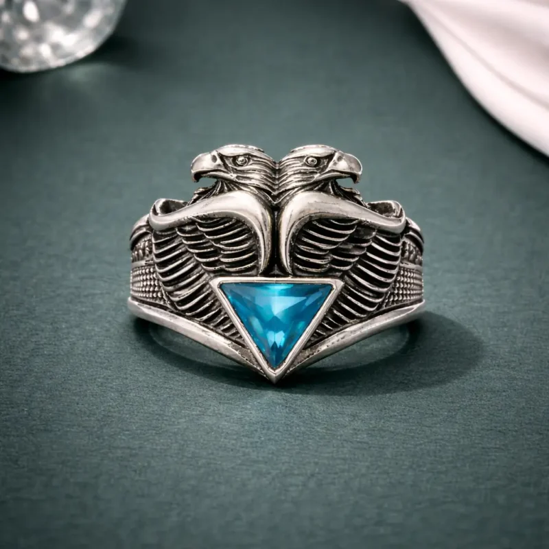 At the center sits a vibrant triangular blue stone, precisely cut and securely set in a metal frame. The geometric stone contrasts beautifully with the organic detailing of the eagles, creating a bold and aggressive design. This is not a subtle piece — it’s built to stand out.