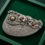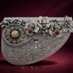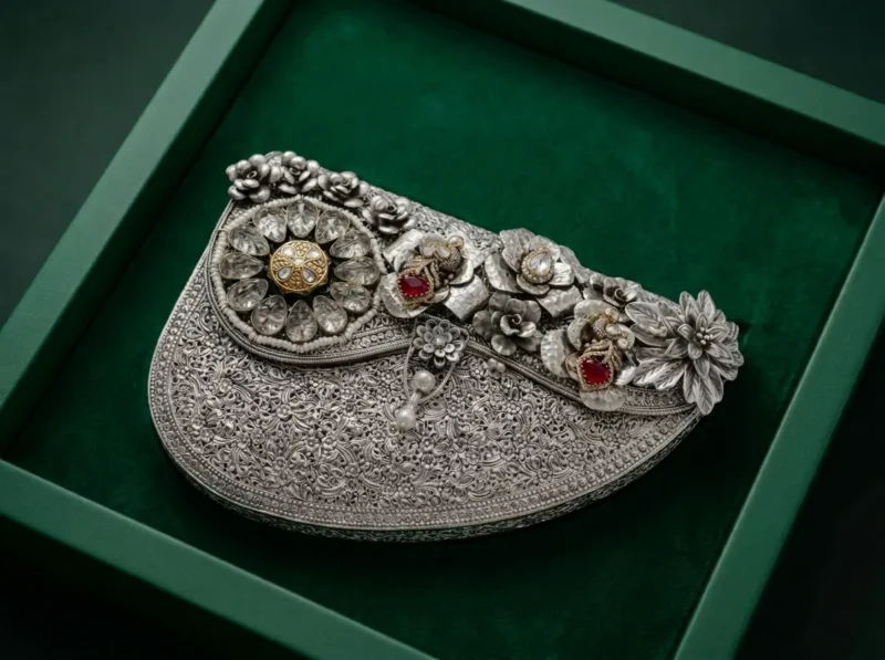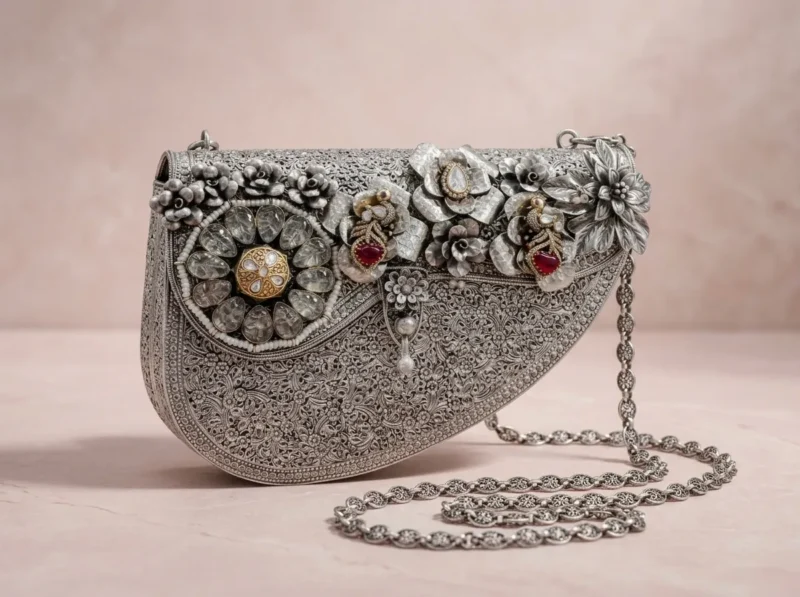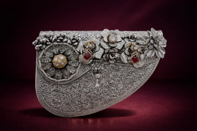Designed to dominate the look. This asymmetrical clutch blends dense filigree carving with oversized crystal-like stone clusters and sculpted metallic flowers. Red stone accents add contrast and intensity. This piece isn’t minimal — it’s dramatic. Best styled with heavily embroidered outfits where accessories need equal presence.