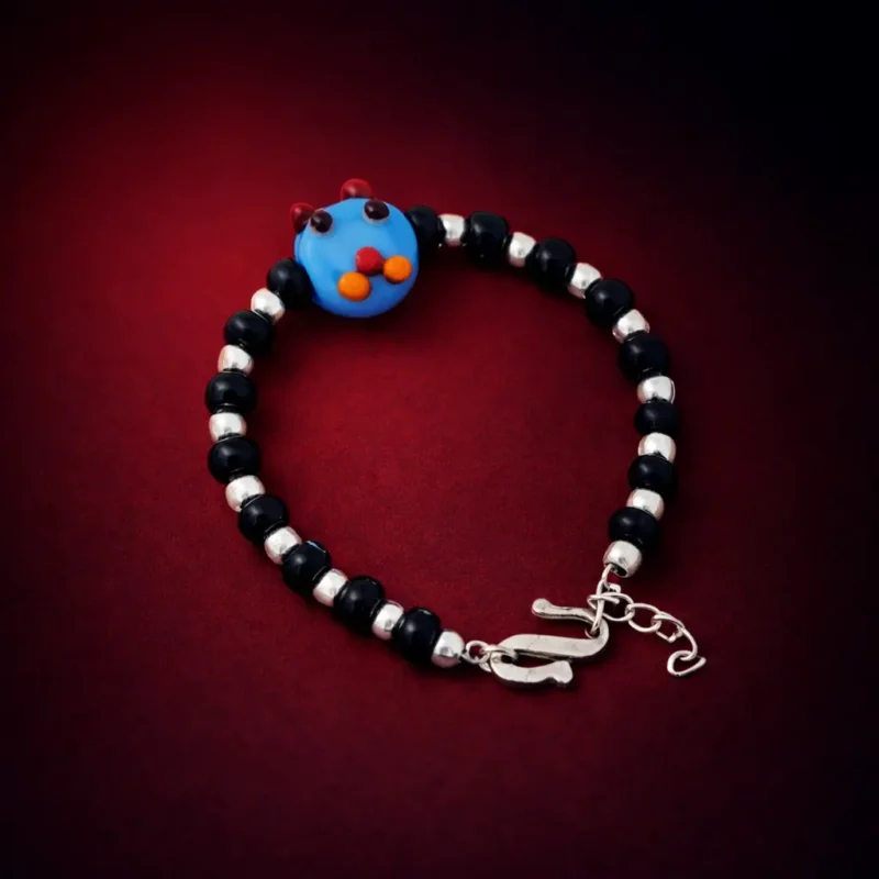 Designed for kids, this bracelet features alternating black and silver beads with a bright cartoon-style centerpiece. Lightweight and comfortable for small wrists.