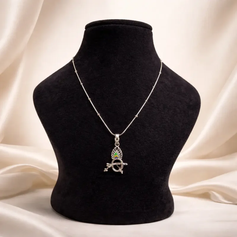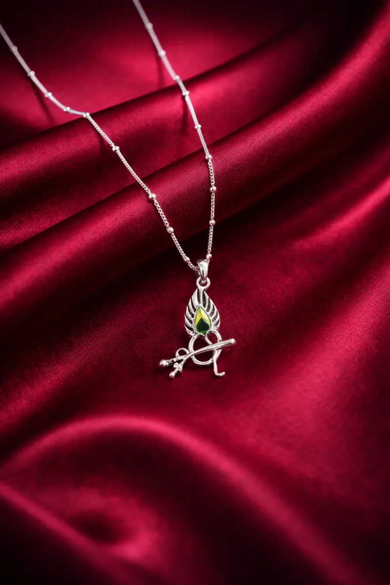 A symbolic Krishna design featuring the flute crossed beneath a stylized peacock feather accent. The structure is compact, lightweight, and designed for daily devotional wear rather than heavy fashion styling.