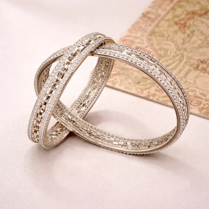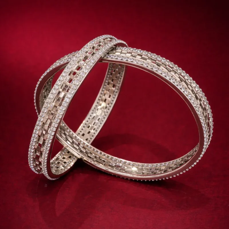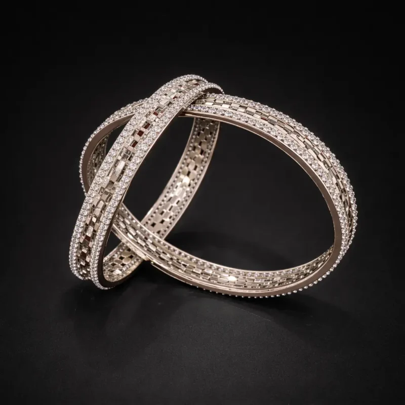 The Lattice Glow Bangles combine craftsmanship and brilliance. The inner surface showcases a detailed lattice pattern, while the outer edges are lined with precision-set stones.