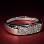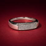 This ring keeps things simple and controlled. A smooth polished band houses a rectangular panel filled with micro-set stones, delivering subtle sparkle without looking flashy.
