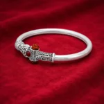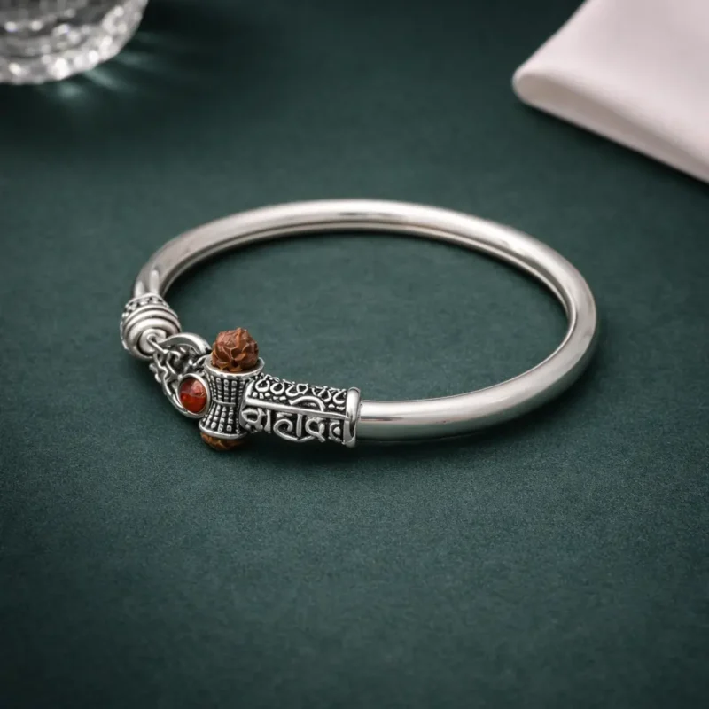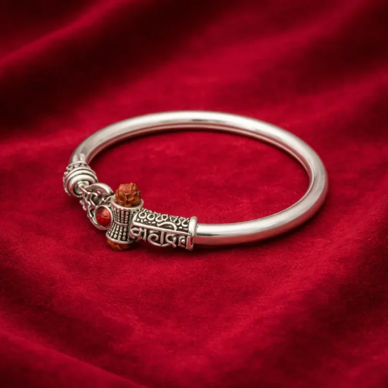 Sleek devotional kada featuring a Damru motif, rudraksha accents, and red stone detailing — a refined Shiva-inspired statement piece.