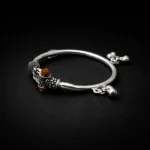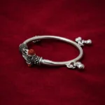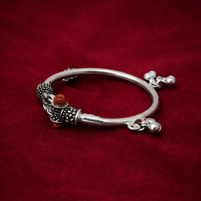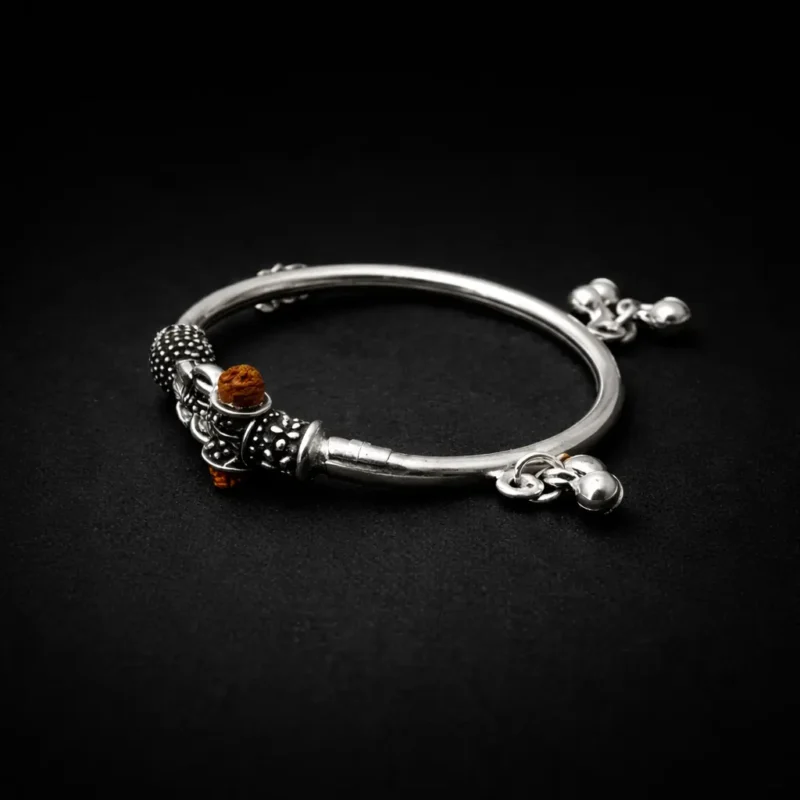 A rigid metal kada designed with a spiritual centerpiece and subtle hanging ghungroo-style charms for added traditional appeal.