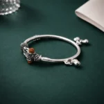 The smooth band keeps the overall silhouette clean, while the detailed centerpiece maintains strong devotional identity. The small hanging elements add movement and a traditional touch, making it slightly more expressive than minimalist kadas.