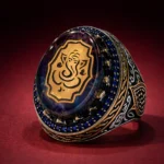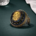 The band is richly decorated with engraved patterns and layered metal textures, reinforcing its premium and ceremonial feel. The combination of gold-tone detailing, dark enamel base, and blue stone border creates strong contrast and depth.