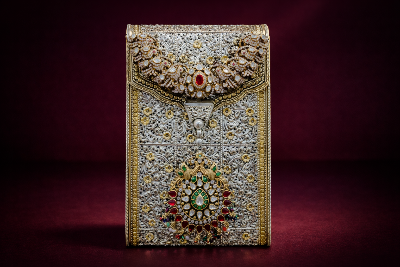 This is a bridal-level piece. Heavy filigree engraving covers the structured rectangular body, framed with gold borders. The bold peacock-style kundan arrangement in red and green stones anchors the design, giving it unmistakable royal character. Ideal for bridal trousseau, high-end wedding functions, and ceremonial occasions.