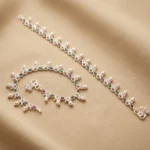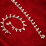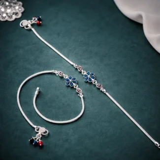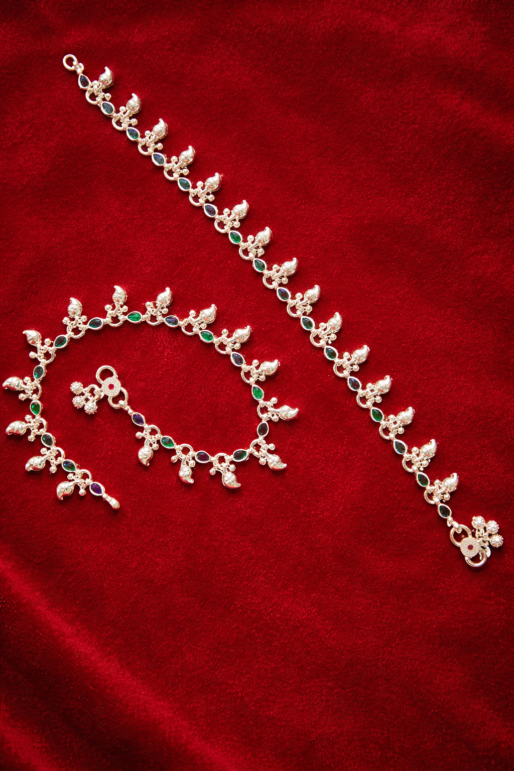 The Mayur Rang Payal is a bold, statement design featuring repeating peacock-style elements enriched with green, blue, and maroon stone details. The structured layout and intricate links give it a rich traditional appeal.