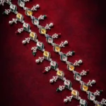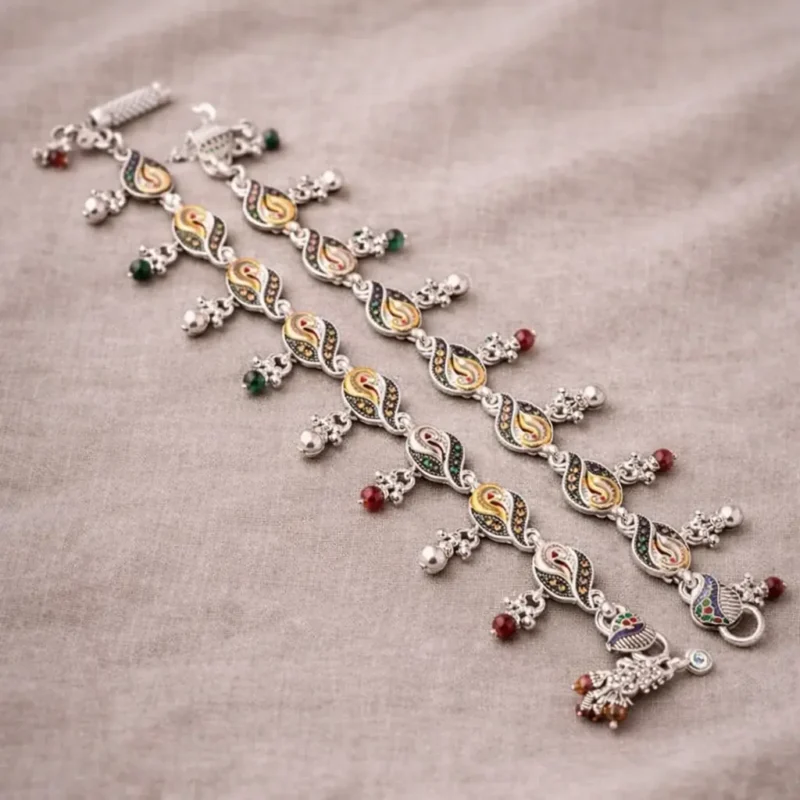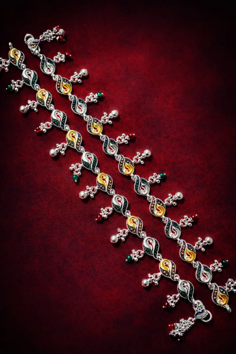 The Mayuri Enamel Vine Payal is built from repeating paisley-shaped segments, each highlighted with vibrant enamel in yellow, green, red, and black. Small bead clusters hang beneath each unit, adding rhythm and traditional character. The design leans playful but still rooted in ethnic craftsmanship. Best suited for festive outfits, mehendi functions, and cultural celebrations.