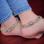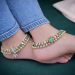The Meera Floral Classic Payal highlights traditional craftsmanship with oxidized silver textures, gold bead accents, and a colorful floral centerpiece. The structured design hugs the ankle neatly while the bead border adds weight and presence. This isn’t minimal—it’s rooted in heritage styling. A strong choice for festive occasions and bridal trousseaus.