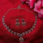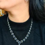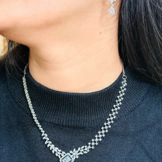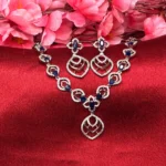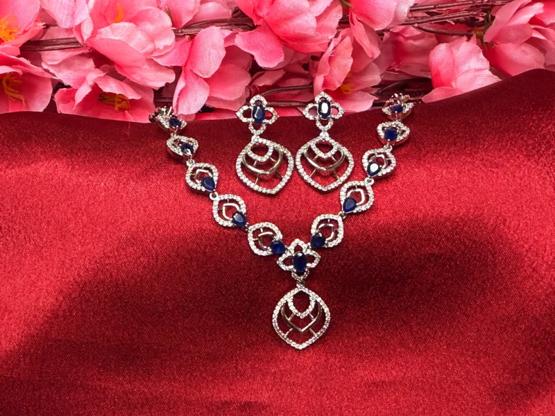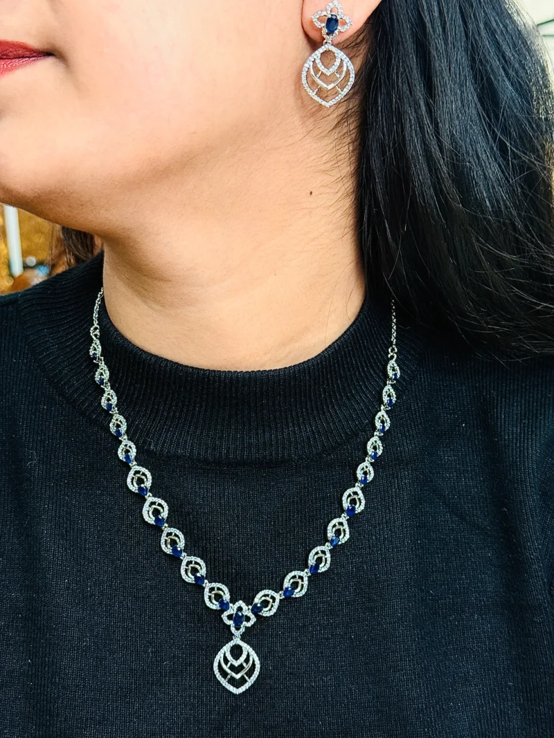 This Midnight Sapphire Elegance Necklace Set is built for a clean, refined look — not loud, but sharp enough to stand out. The deep blue stones give it a rich contrast against the silver finish, making it ideal for darker outfits and evening styling. The design flows smoothly along the neckline with a subtle center pendant that adds just the right amount of detail without overcomplicating the piece. Paired with matching geometric drop earrings, this set works best for parties, dinners, and occasions where you want to look polished without going over the top. It’s not bridal-heavy — it’s controlled elegance.