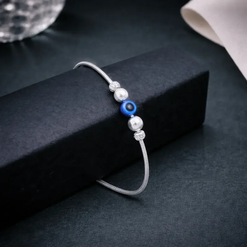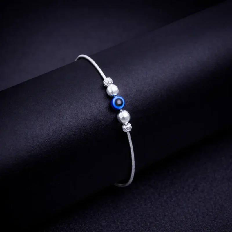 •Design Elements: Features a small, circular blue “Evil Eye” bead flanked by two bezel-set clear crystals.