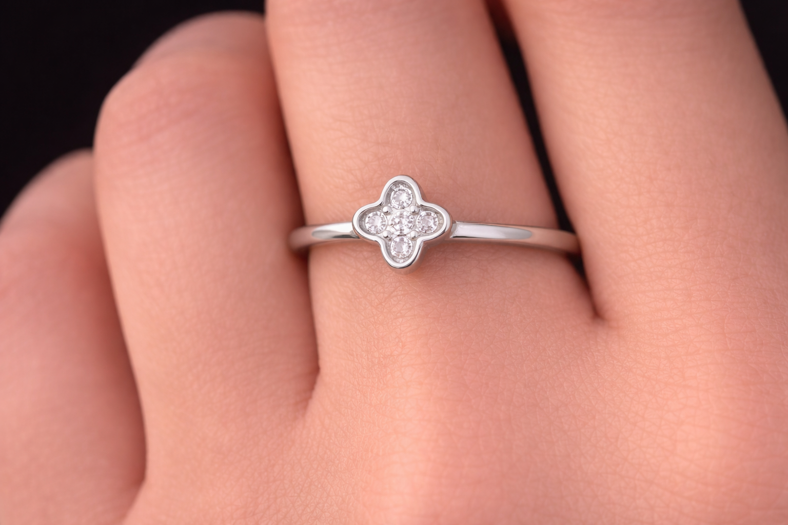 This clover-style ring features four stones arranged in a clean and minimal design. Crafted from 925 sterling silver, it symbolizes luck and positivity. Lightweight and versatile, it is suitable for daily wear.