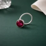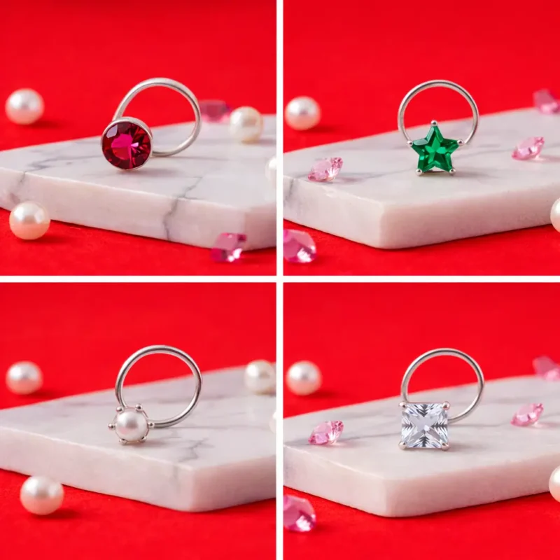 The combo features a sparkling red stone nose pin, a green star-shaped stone design, a classic pearl nose pin, and an elegant square crystal nose pin. Each piece is crafted with a sleek silver finish and lightweight circular hook design, ensuring comfort and easy wear throughout the day.