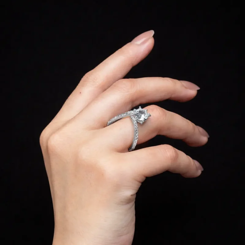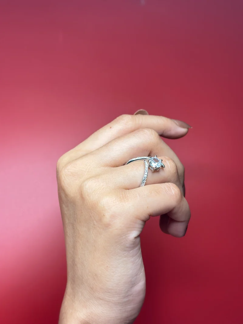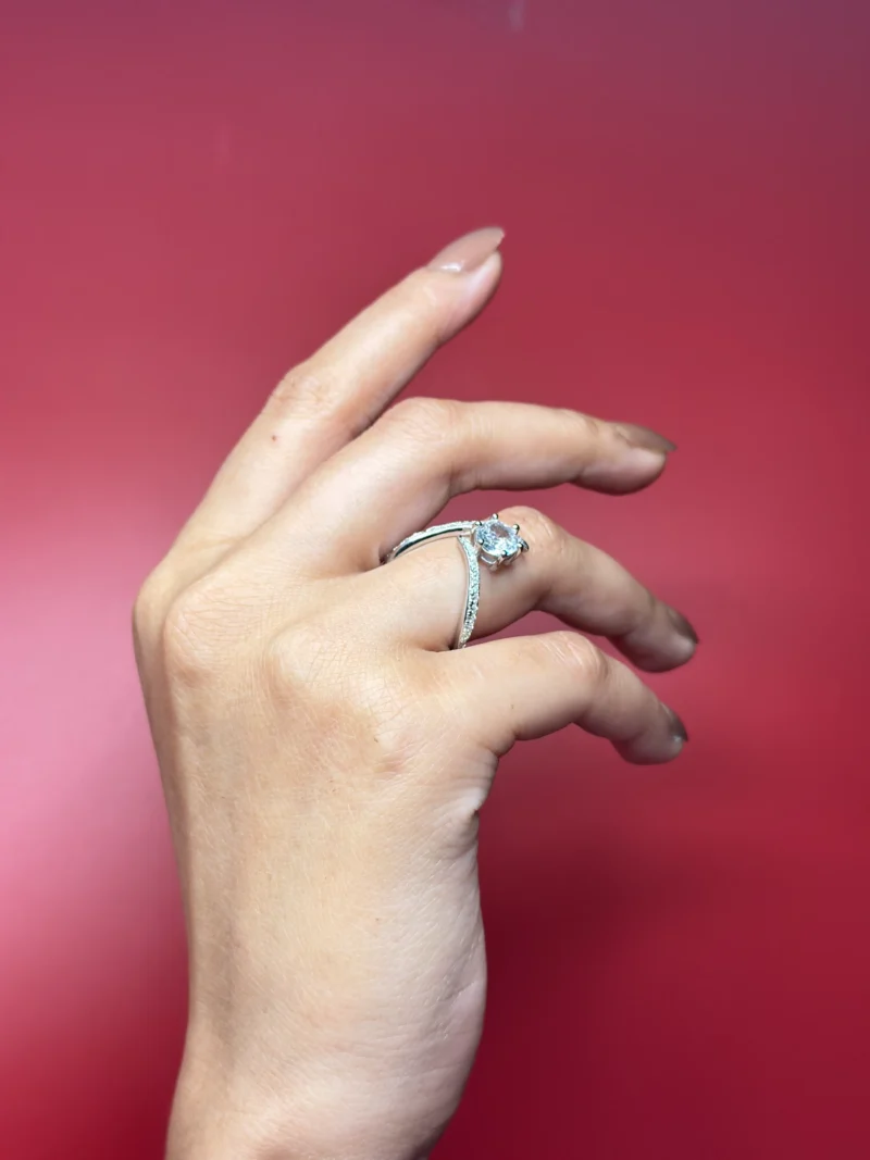 This design works well as an engagement-style ring or as a fashion-forward daily piece for buyers who prefer contemporary lines over classic halos.