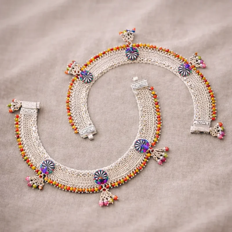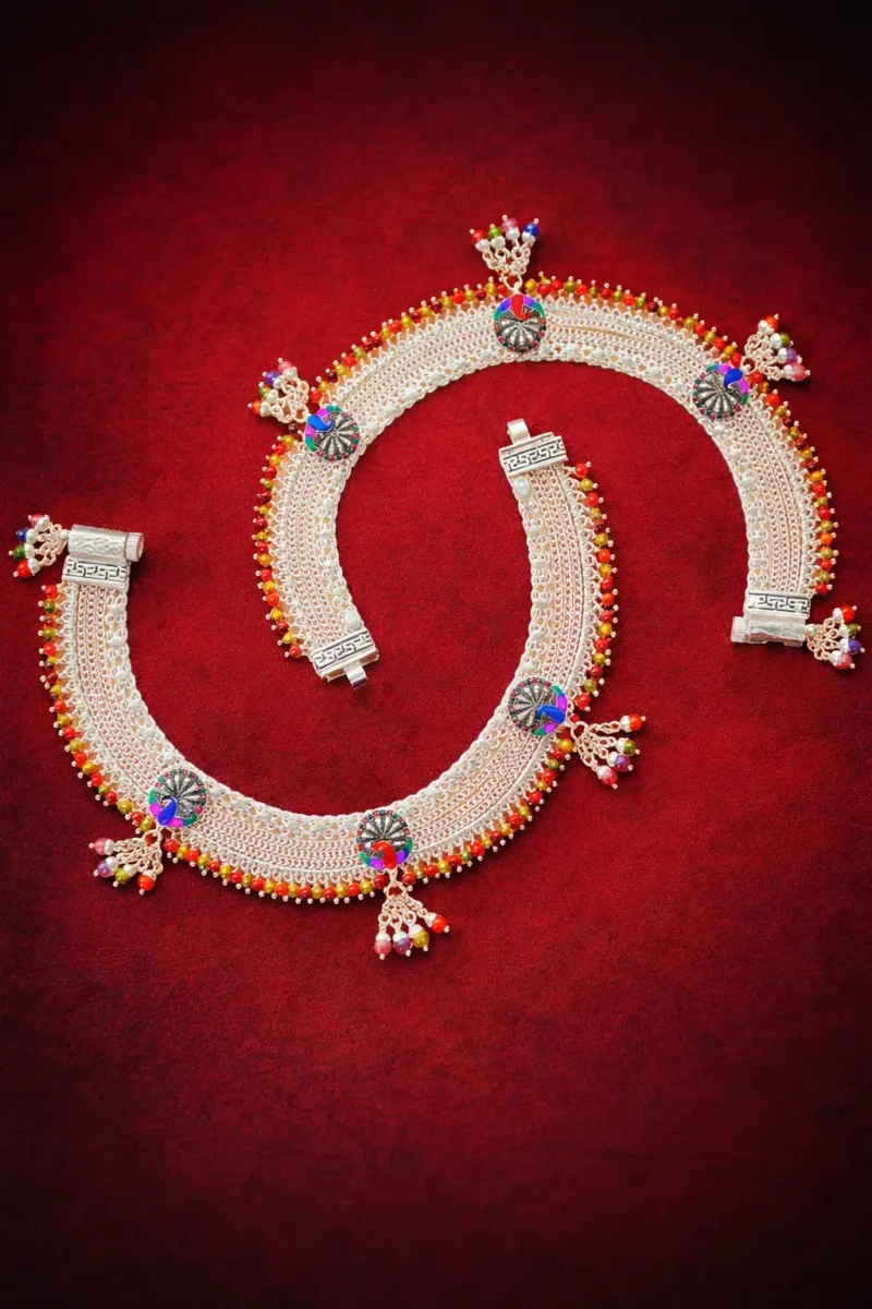 The Morbagh Peacock Bead Payal features a wide silver band bordered by vibrant multicolor beads. Circular medallions with peacock-inspired enamel detailing sit evenly across the design, finished with hanging bead clusters. This piece is festive, colorful, and visually rich — best suited for cultural events and celebratory outfits.