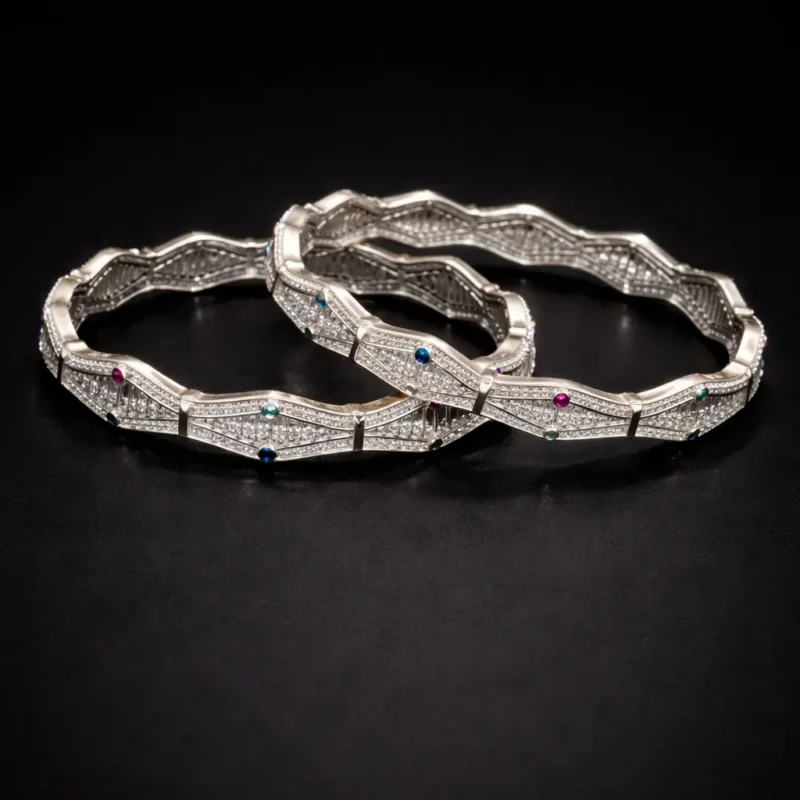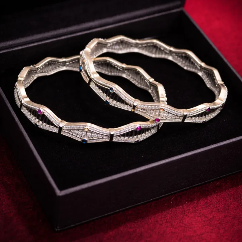 Presented in a premium box, this design clearly targets bridal and occasion wear. It carries more personality than the previous pieces and should be positioned accordingly — not as a basic silver bangle, but as a curated premium statement set.