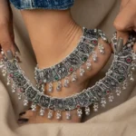 The Nritya Panel Ghungroo Payal features rectangular engraved panels depicting classical dance-inspired patterns, bordered with red and green stone accents. Multiple ghungroo clusters hang below each segment, adding sound and movement. The oxidized finish enhances depth and contrast, giving it a bold heritage look. This is a strong ethnic piece — best paired with traditional outfits rather than casual wear.