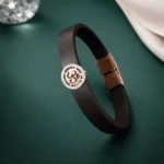 The Om Aura Black Band Bracelet blends faith with contemporary design. At the center sits a finely crafted Om symbol, framed in a circular halo of shimmering stones, set against a sleek matte black band.