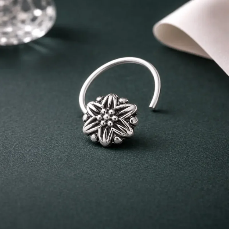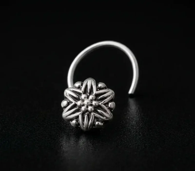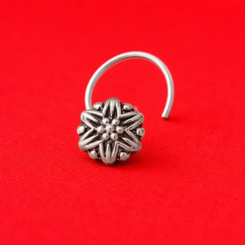 Add a touch of traditional elegance to your look with this oxidized star floral nose pin. Designed with a beautiful star-shaped floral pattern and detailed beadwork at the center, this piece reflects classic Indian jewelry craftsmanship.