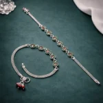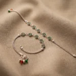 The Panna Chakra Payal stands out for its structured, repeating circular pattern. Each round element is highlighted with green detailing and a contrasting red center, giving it a vibrant but controlled aesthetic.