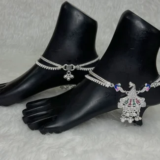 The flower charm is decorated with sparkling stones in pink, green, purple, and white, creating a bright and eye-catching design. The detailed peacock elements on both sides enhance the traditional aesthetic, giving the anklet a graceful and artistic look.