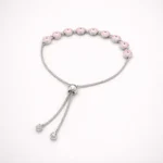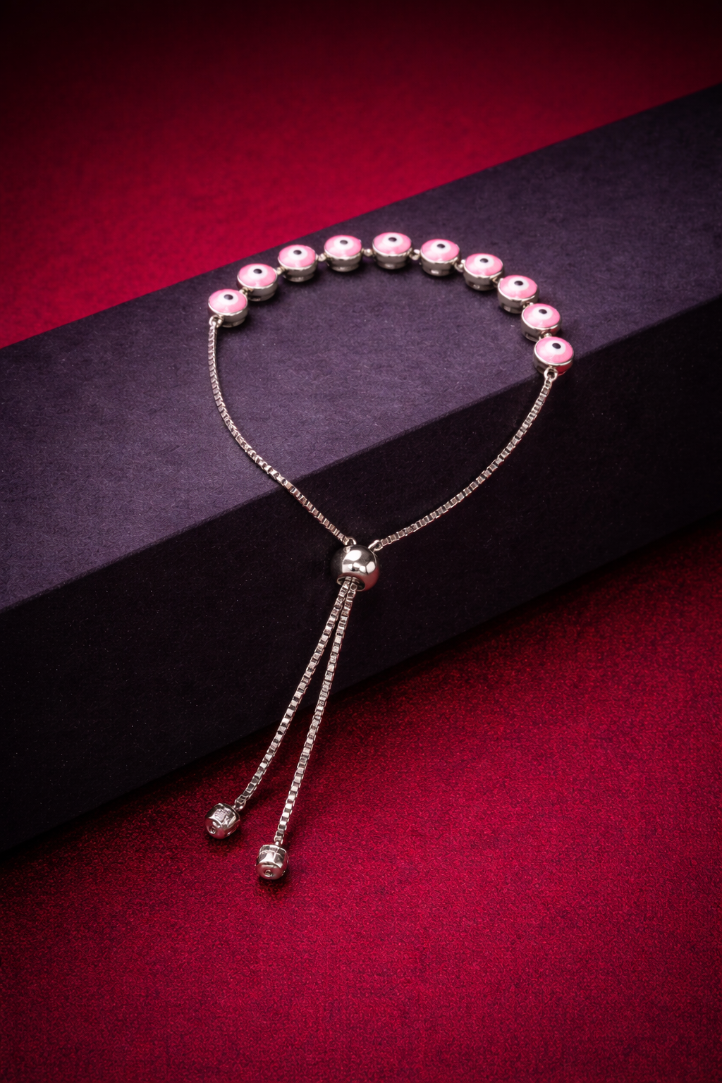 This bracelet features a soft pink evil eye charm paired with a slider mechanism for comfort. A stylish choice for daily wear and gifting.