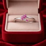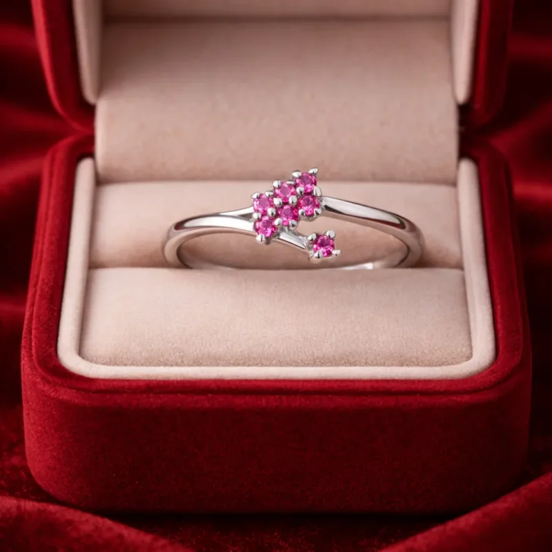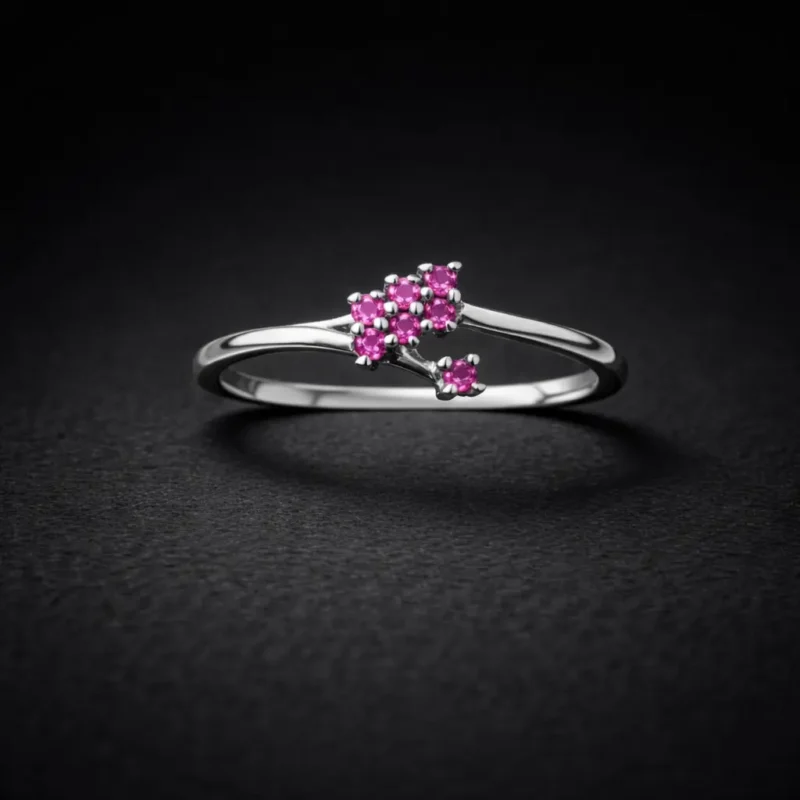 This floral silver ring features pink-toned stones arranged in a charming flower design. Crafted in 925 sterling silver, it delivers a feminine and elegant look. Lightweight and comfortable, it is suitable for daily wear as well as festive occasions.
