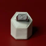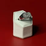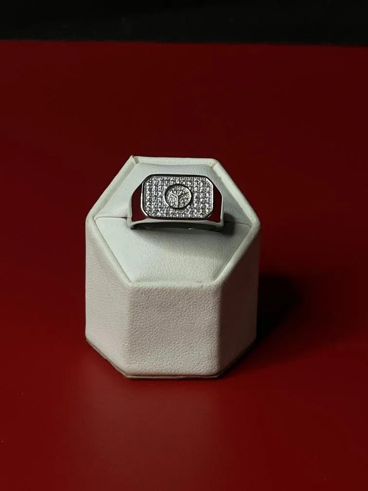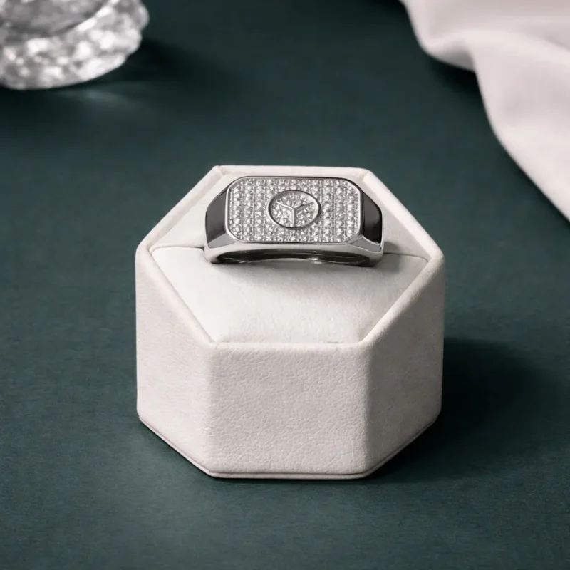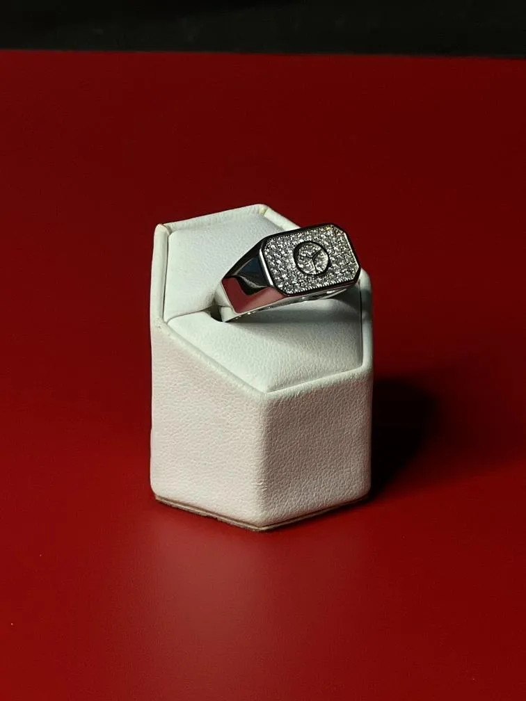The Prestige Oval Emblem Ring blends clean structure with refined sparkle. The rectangular top is fully set with fine micro stones, creating a consistent shimmer across the surface. At the center sits a polished oval emblem, adding contrast and a focal point that breaks the uniform texture.