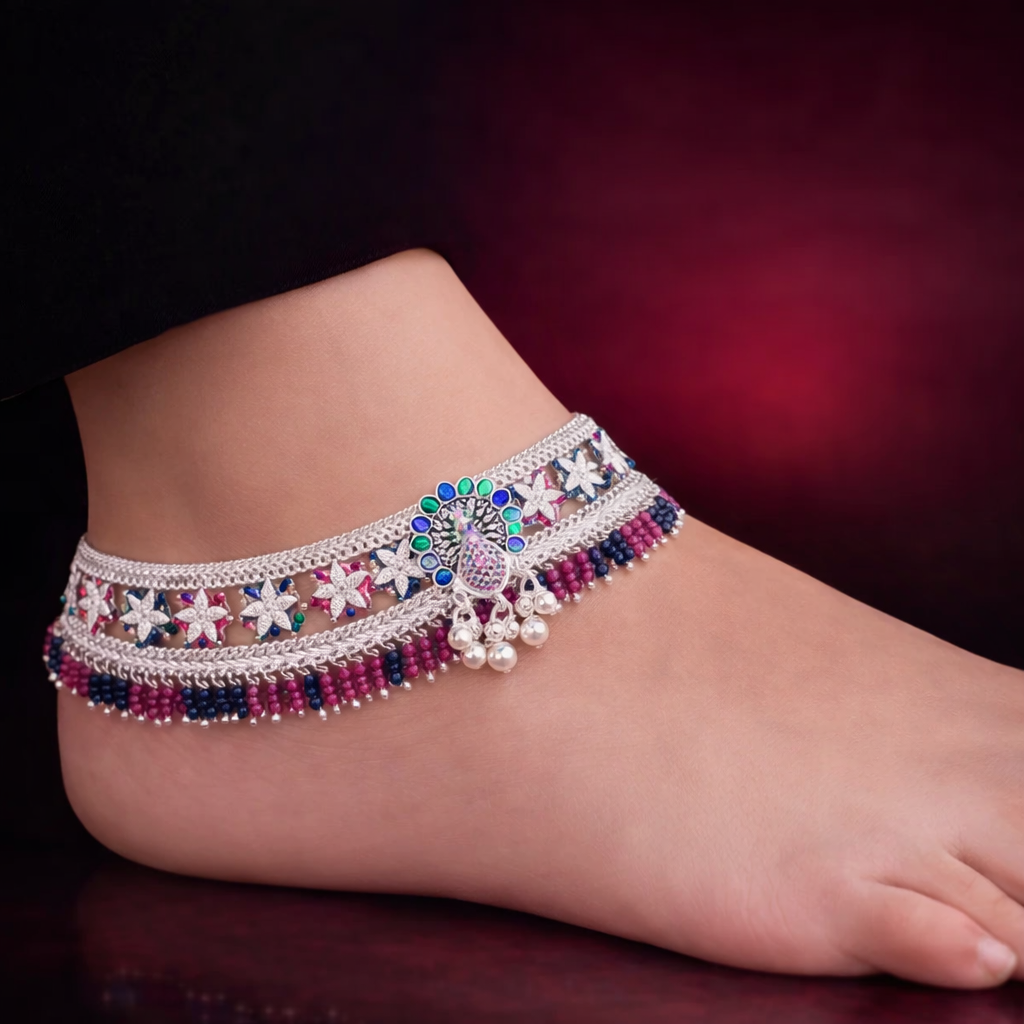 The Raj Peacock Bridal Payal builds around a prominent peacock centerpiece surrounded by multicolor detailing and pearl-style drops. The layered chain structure adds volume and ceremonial presence.