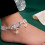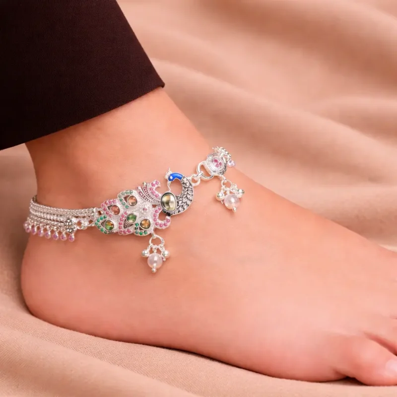 The Rajsi Peacock Kundan Payal is a centerpiece design built around a bold peacock motif. Decorated with multicolor stones and finished with pearl-style hanging beads, this piece carries strong bridal and festive energy.