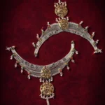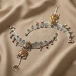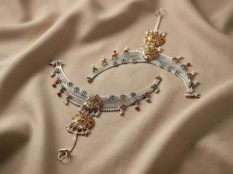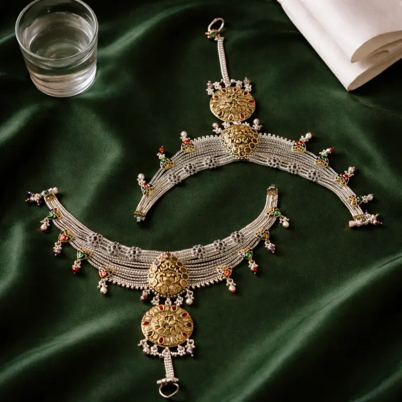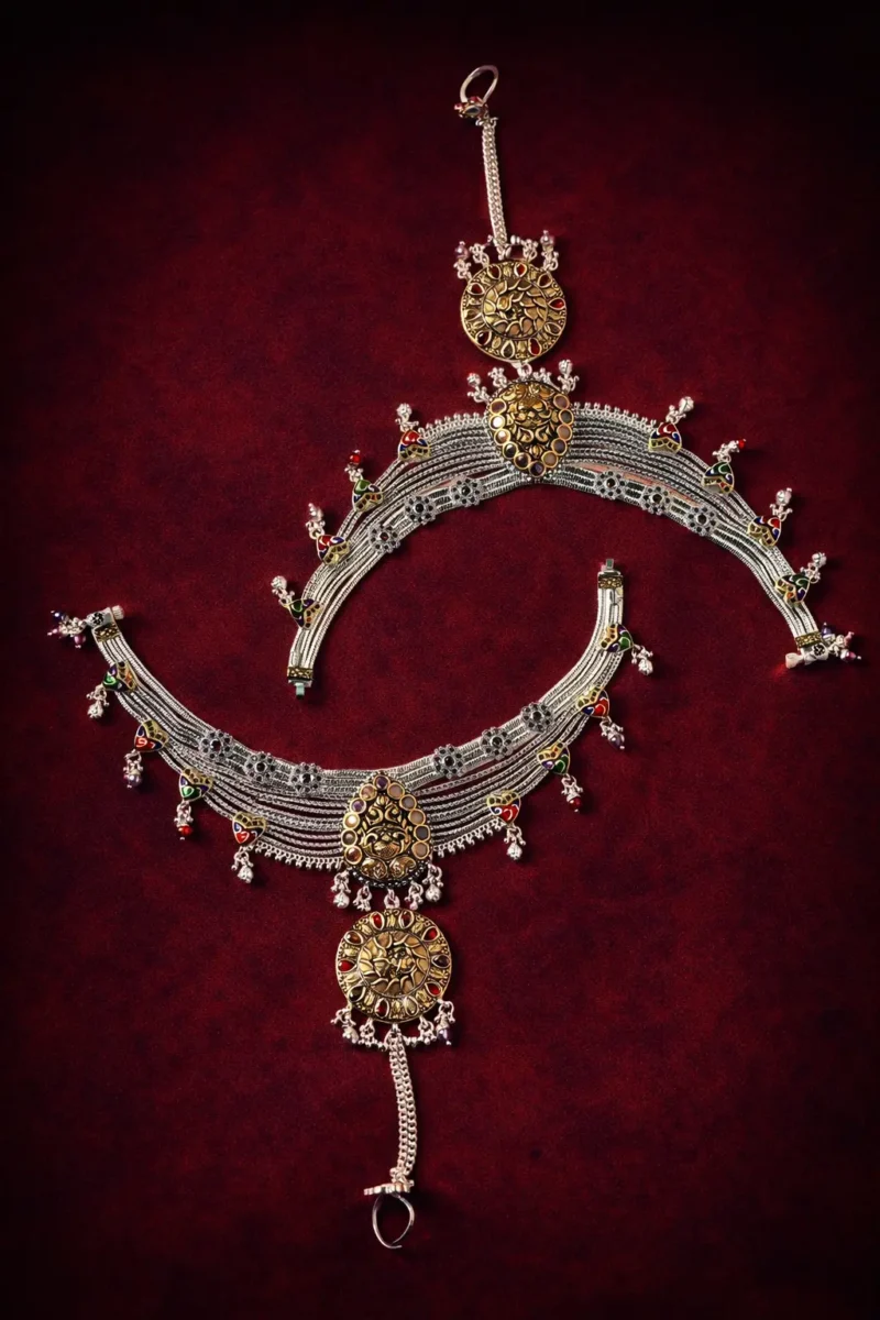 The Rajtilak Antique Statement Payal combines oxidized silver structure with bold gold-toned circular medallions. Each medallion is engraved and framed with stone accents, finished with hanging bead clusters. The layered top lines give it width and authority. This design is unapologetically grand — ideal for weddings, bridal looks, or high-impact festive styling.