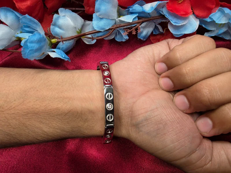 Let’s be clear—this is not for someone who wants to blend in. This bracelet is designed to stand out instantly. The red enamel strip cuts through the silver base, giving it a sharp, aggressive look that grabs attention the moment it hits the wrist.