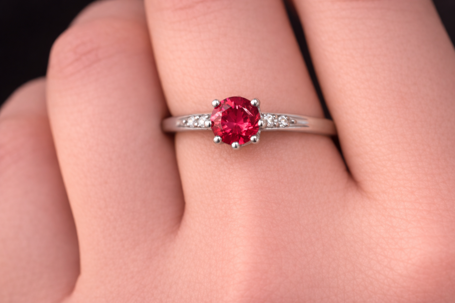 Red round solitaire ring with side stone accents.