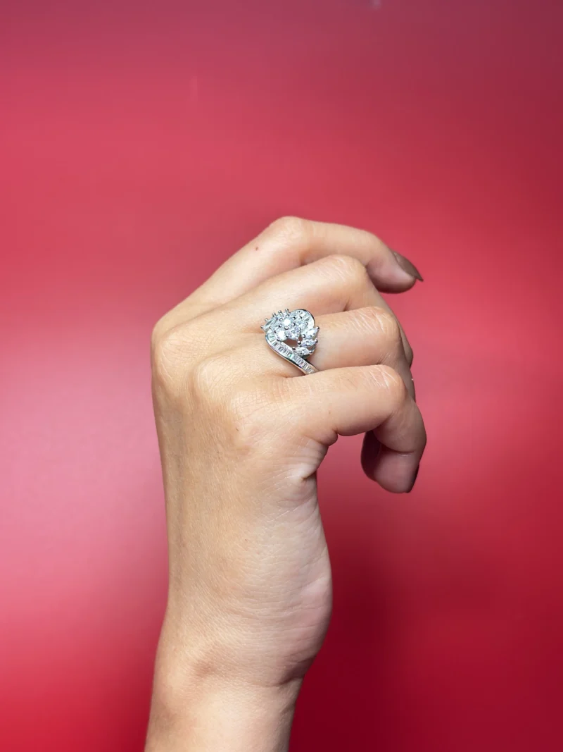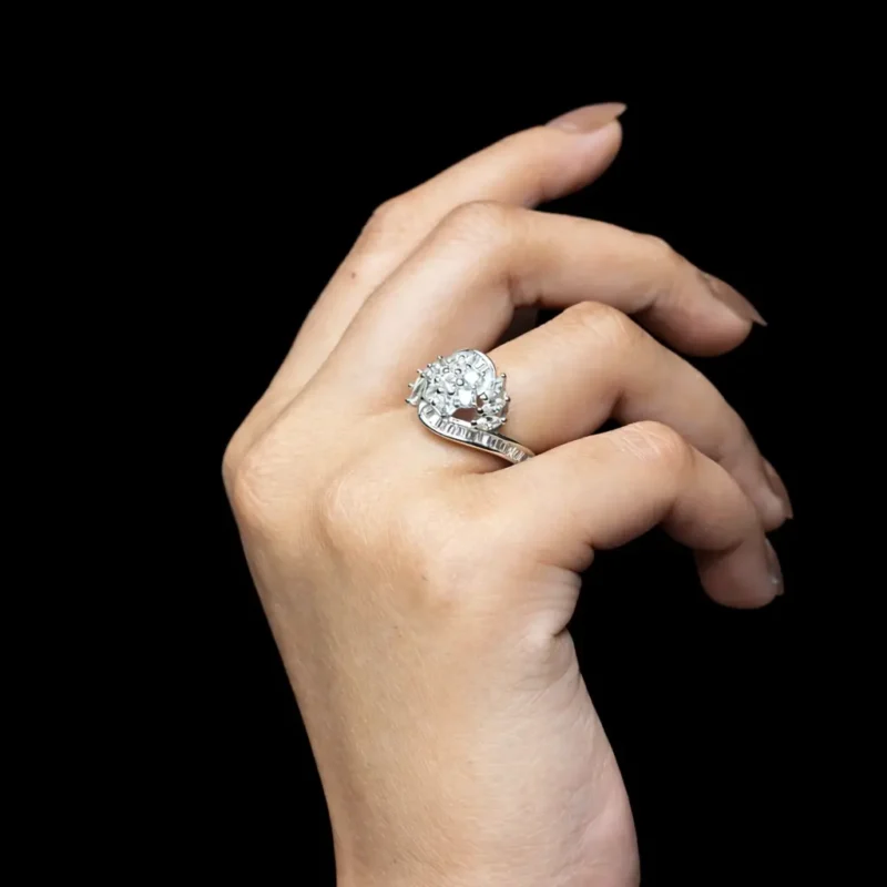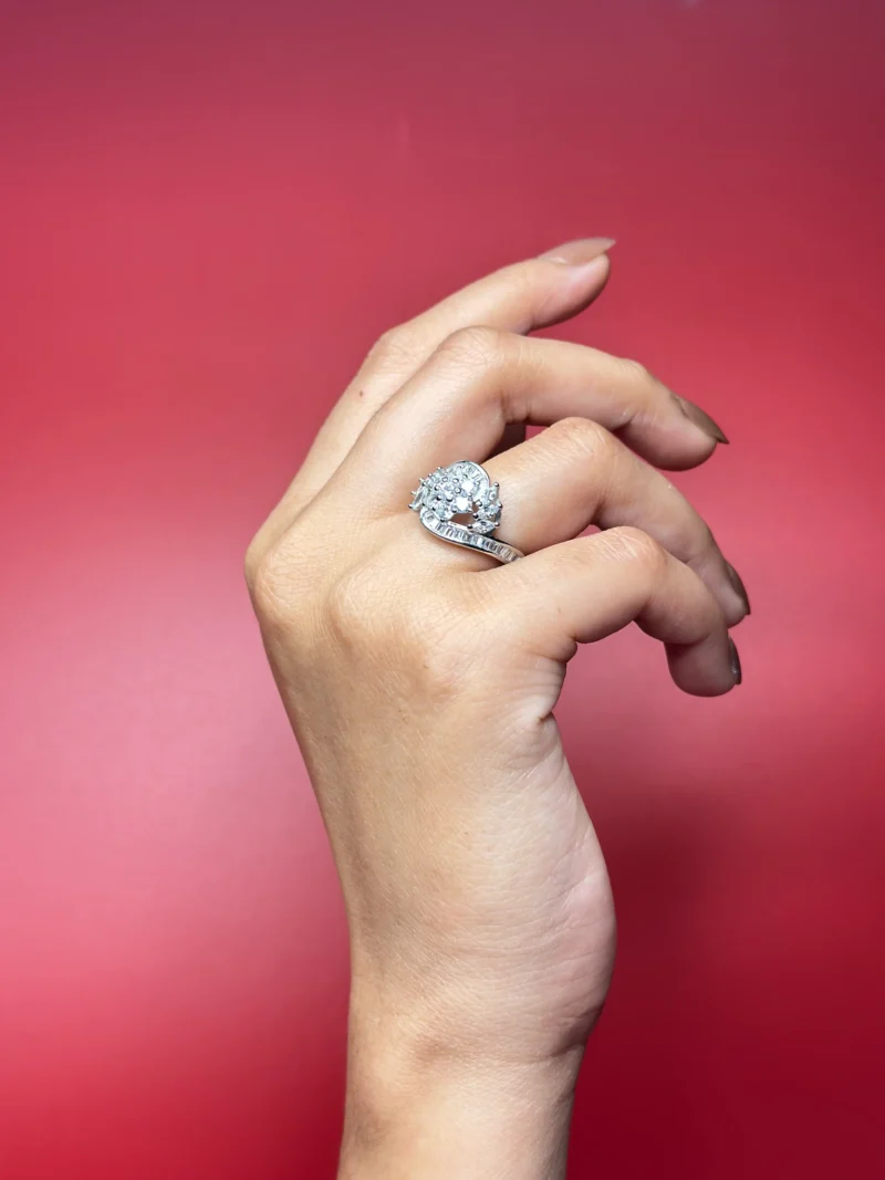 The Regal Cluster Crown Ring features a layered circular cluster design with a raised crown setting that enhances depth and light reflection. The band incorporates sleek baguette detailing, adding structure and luxury contrast to the dense center cluster.