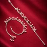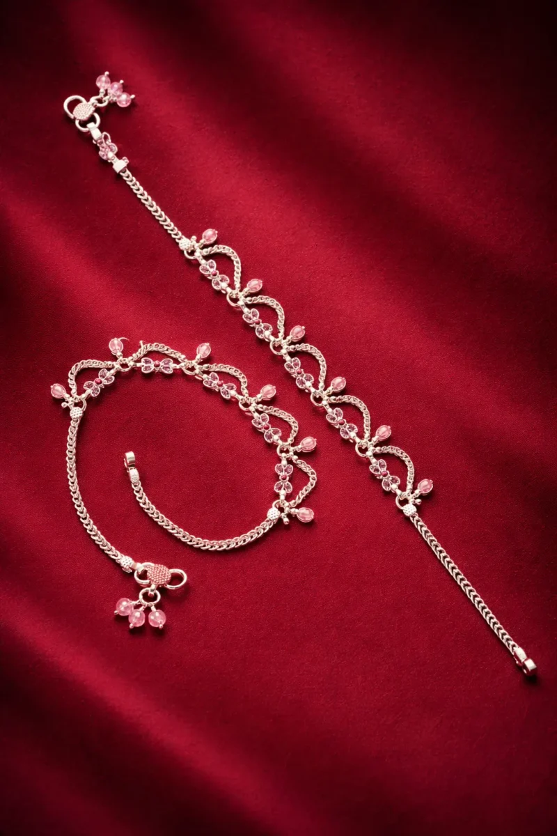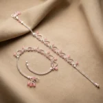 The Rose Arc Designer Payal features graceful curved segments decorated with pink stone accents, creating a flowing silhouette around the ankle. The structure gives it a slightly more premium and designer feel compared to basic chain styles.