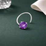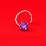 Enhance your look with this round purple crystal nose pin, designed to add a subtle yet vibrant sparkle to your style. The nose pin features a beautiful round faceted purple crystal stone secured in a delicate prong setting, creating a brilliant shine.