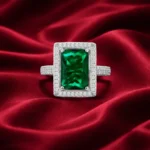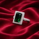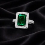 A striking emerald-cut green stone set in a double halo of shimmering crystals, crafted in premium silver for a bold and refined statement.