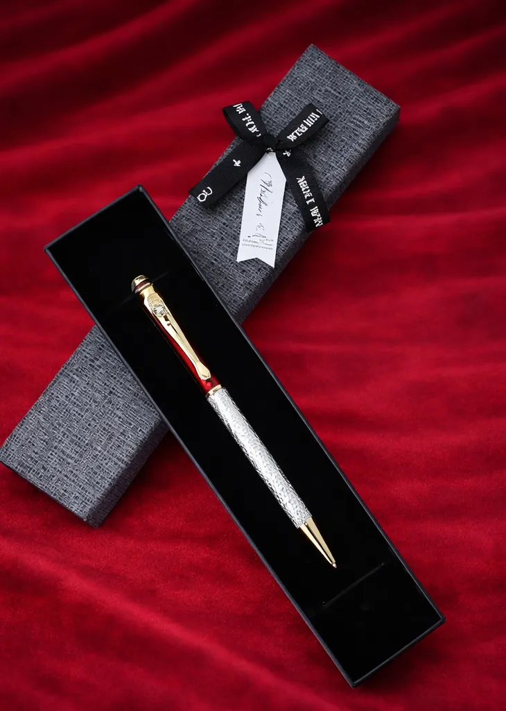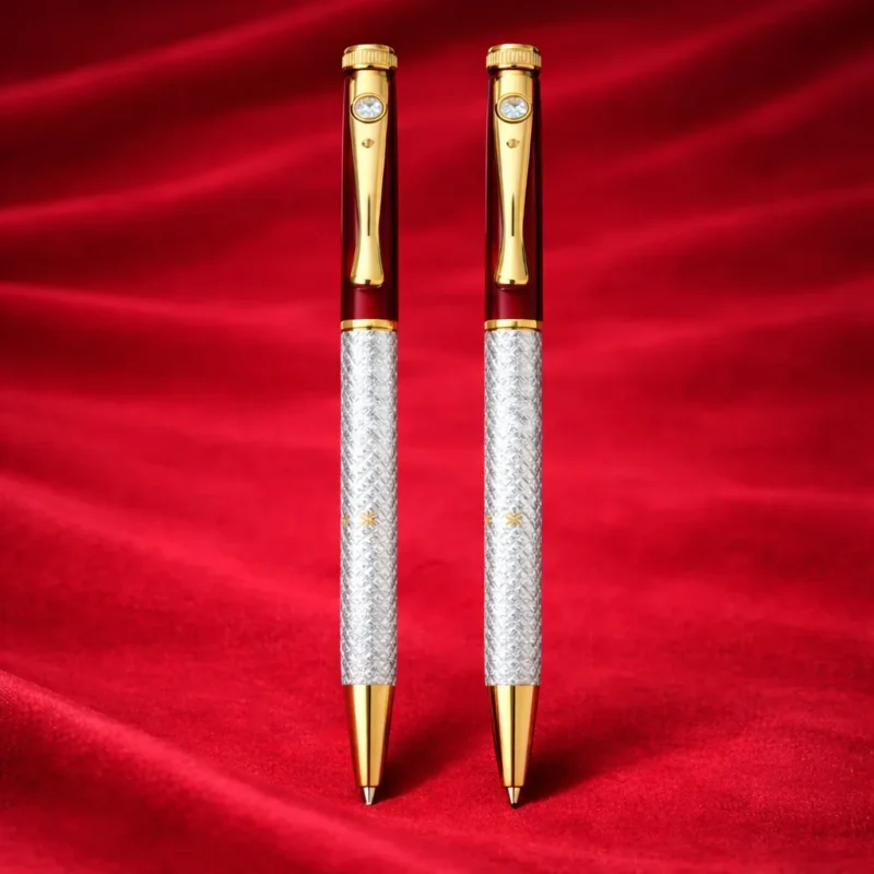 This elegant pen set is built for presence. The upper body features a deep red lacquer finish paired with a polished gold clip and trim, highlighted by a subtle crystal accent near the top. The lower barrel is finished in a finely textured silver pattern that enhances grip while adding a refined contrast.