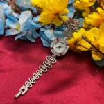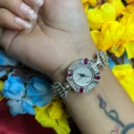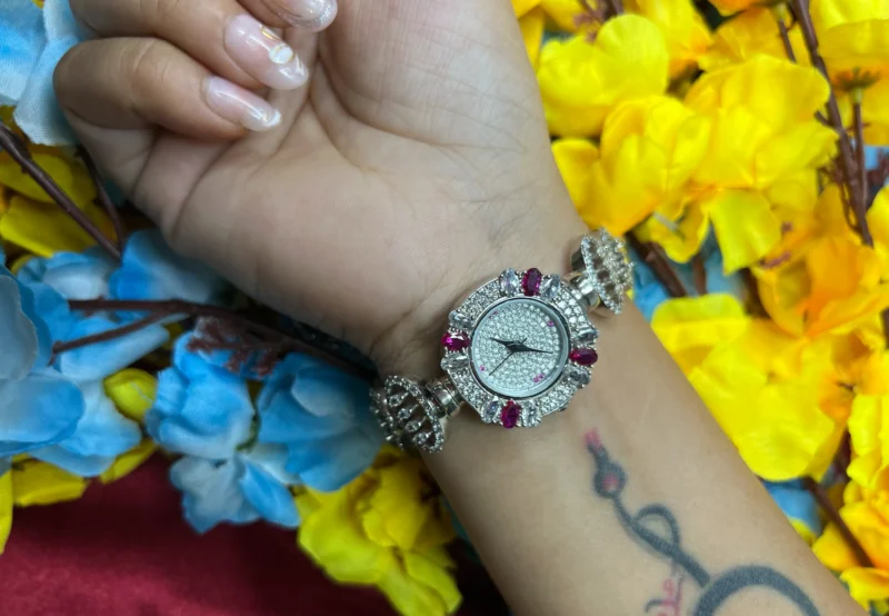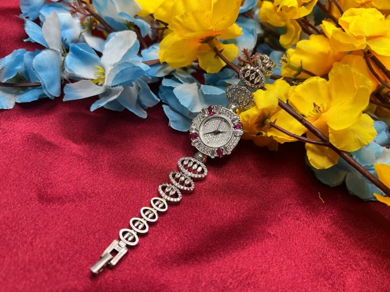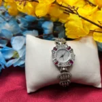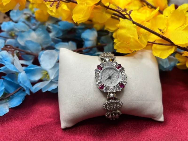 The Royal Ruby Halo Silver Watch blends timeless elegance with modern luxury. Designed with a shimmering stone-studded dial and surrounded by rich ruby-toned accents, this watch instantly elevates any outfit. The intricate detailing and polished silver finish give it a premium aesthetic, making it ideal for weddings, parties, and special occasions. More than just a timepiece, it’s a statement accessory crafted to stand out.