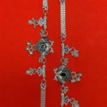 Intricate round decorative charms with dark stone centers enhance the anklet’s design, while tiny dangling bead accents add gentle movement and shine as you walk. The combination of geometric motifs, colorful stones, and detailed silver craftsmanship gives the anklet a rich ethnic appeal.