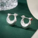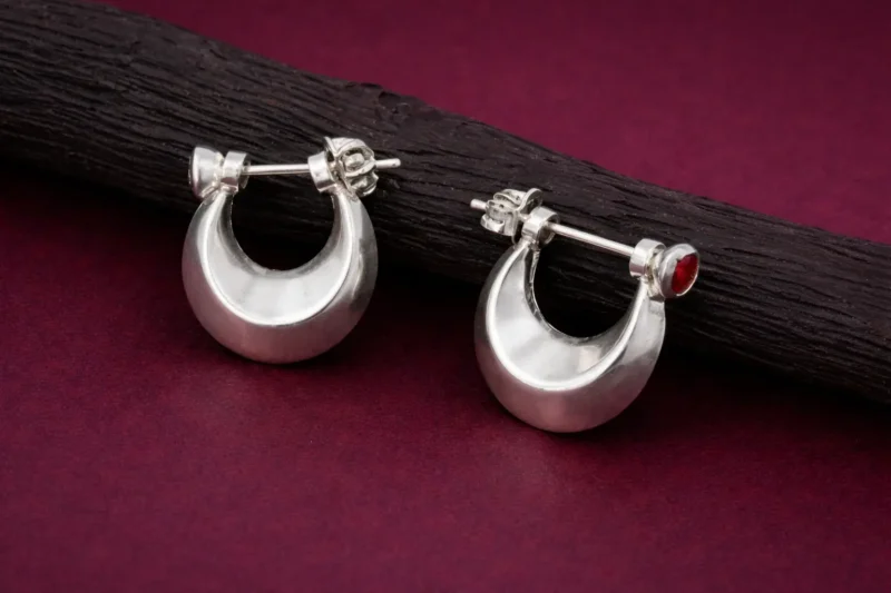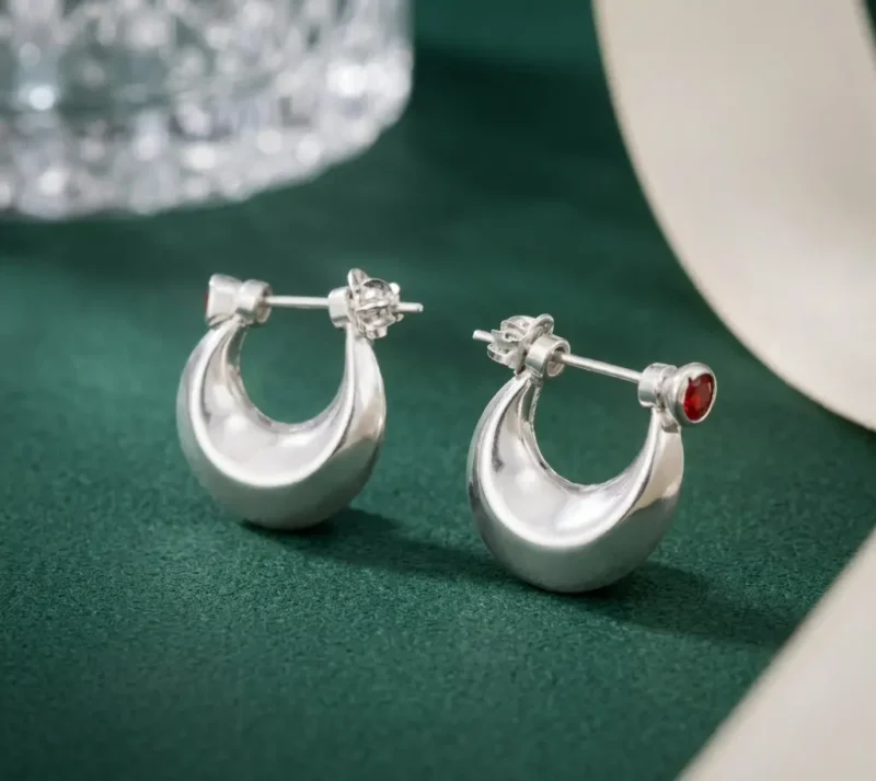 Make a refined yet bold statement with these Ruby Accent Crescent Silver Earrings, designed to combine classic silver craftsmanship with a subtle touch of color. The earrings feature a smooth crescent-shaped structure with a thick, polished silver surface that gives them a strong and elegant presence.