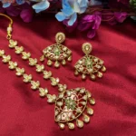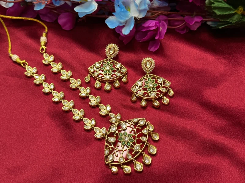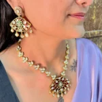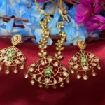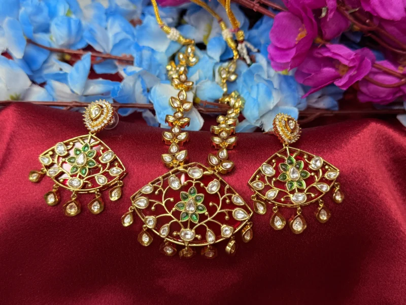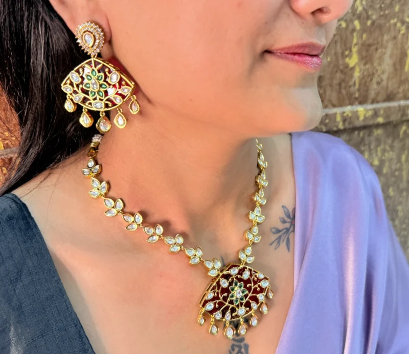 This ruby kundan floral necklace set is made for customers who want something bold and eye-catching. The deep red enamel combined with kundan stones gives it a strong royal vibe that instantly stands out. Unlike subtle pieces, this one is meant to be noticed — ideal for weddings, functions, and heavy outfits. If someone is wearing plain clothing, this alone can carry the entire look.