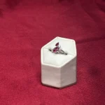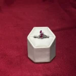 The curved structure combined with leaf-shaped ruby stones gives it a graceful, slightly romantic feel. The small central crystal adds a touch of sparkle, but the overall design stays minimal and lightweight.