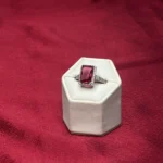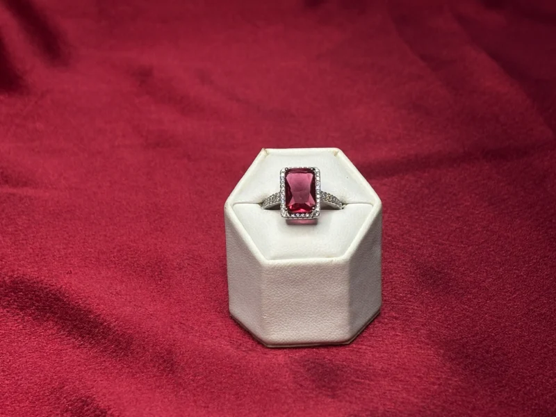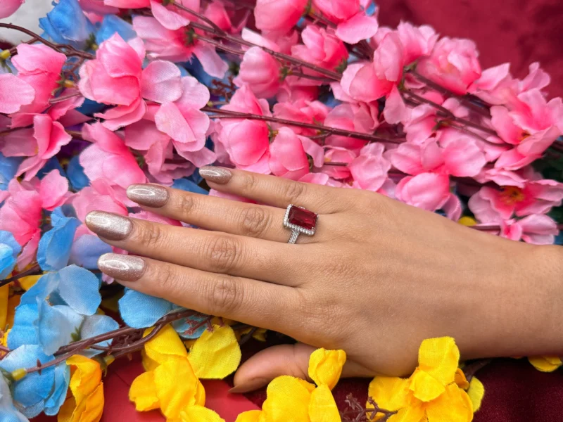 A bold emerald-cut ruby red crystal ring framed by a sparkling halo, designed for a striking and luxurious statement.