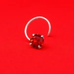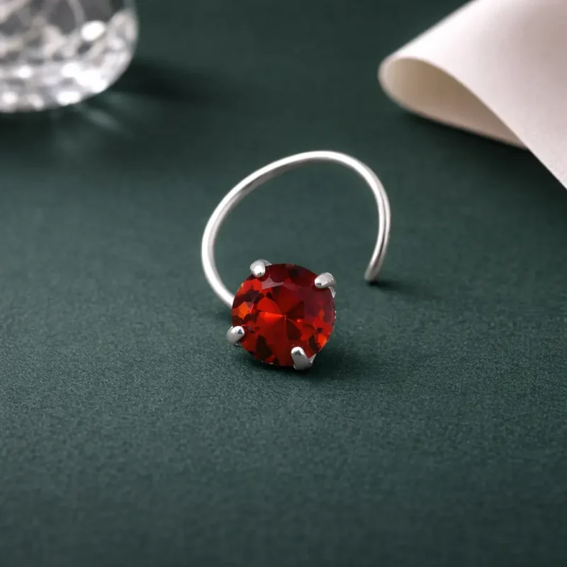 Add a bold and elegant sparkle to your look with this ruby red crystal nose pin. Designed with a round faceted ruby red crystal stone secured in a delicate prong setting, this piece offers a vibrant and eye-catching shine.
