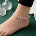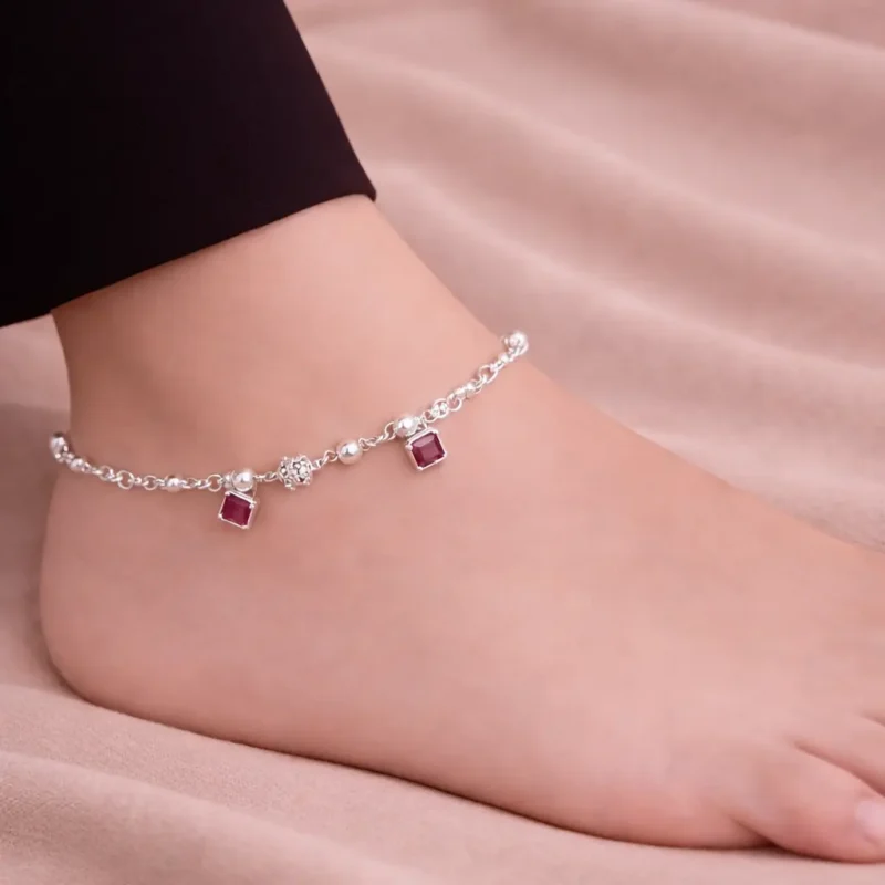 The Ruby Square Dangle Payal features a delicate silver chain base with spaced pearl details and deep ruby square stone drops. The small hanging elements create movement without adding bulk.