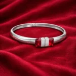 The vibrant red stone beautifully contrasts with the polished silver finish, making the bracelet stand out while maintaining an elegant and minimal aesthetic. It pairs effortlessly with both traditional outfits and contemporary fashion, making it a versatile piece in any jewelry collection.