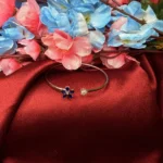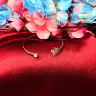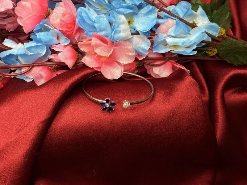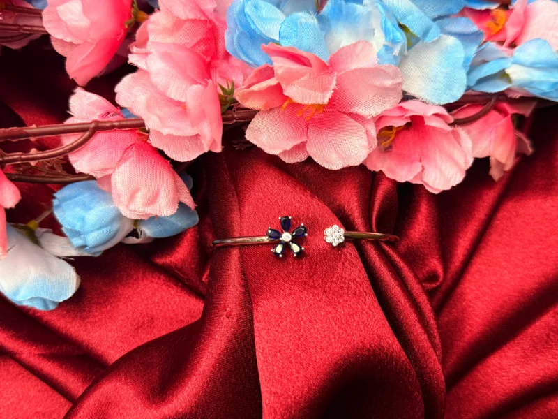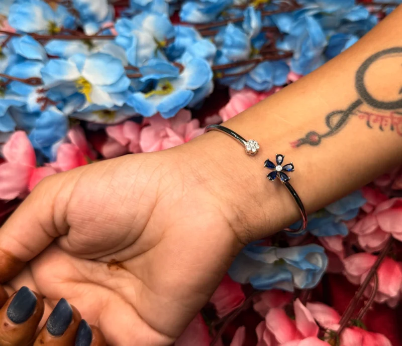 This sapphire bloom silver kada is a clean, sharp design that works without trying too hard. The open cuff structure keeps it practical and easy to wear, while the deep blue floral element adds richness and contrast. One side features a detailed sapphire-toned flower, and the other balances it with a subtle crystal cluster. The simplicity is the strength here — it’s not bulky or overdesigned, which makes it perfect for daily wear, casual outfits, or even light festive styling. If someone wants a piece that looks premium but stays effortless, this delivers exactly that.